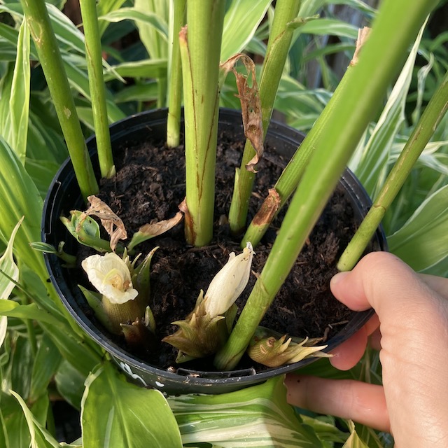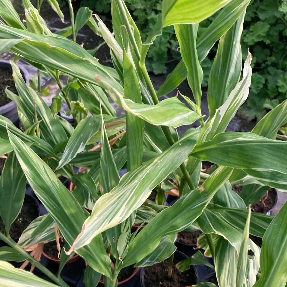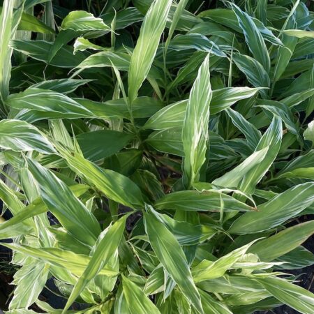 Le gingembre japonais panaché (Zingiber mioga ‘Dancing Crane’) est une plante vivace ornementale et comestible, prisée pour son feuillage élégant, vert strié de blanc crème, et ses boutons floraux comestibles.
