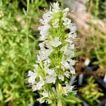 L’hysope blanche (Hyssopus officinalis albus) est une plante vivace aromatique et médicinale, appréciée pour ses fleurs blanches et son feuillage parfumé.