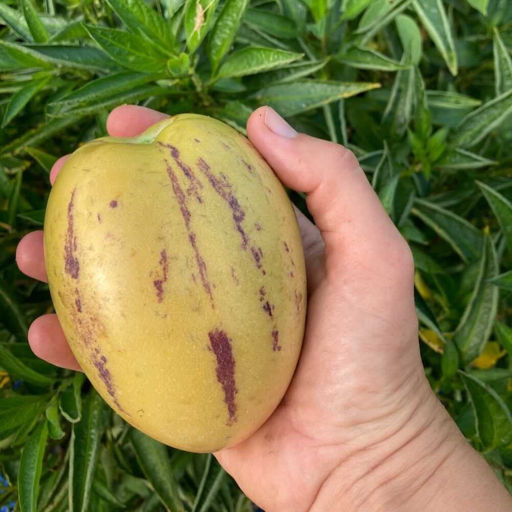 La poire-melon (Solanum muricatum), ou pepino, est une plante vivace subtropicale produisant des fruits ovales jaune strié de pourpre, à la saveur douce entre melon et poire.
