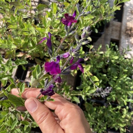 La sauge arbustive violette (Salvia microphylla ‘Papillon de Nuit’) est une vivace buissonnante au feuillage aromatique et aux fleurs violet foncé, qui fleurit abondamment du printemps jusqu’aux premières gelées.